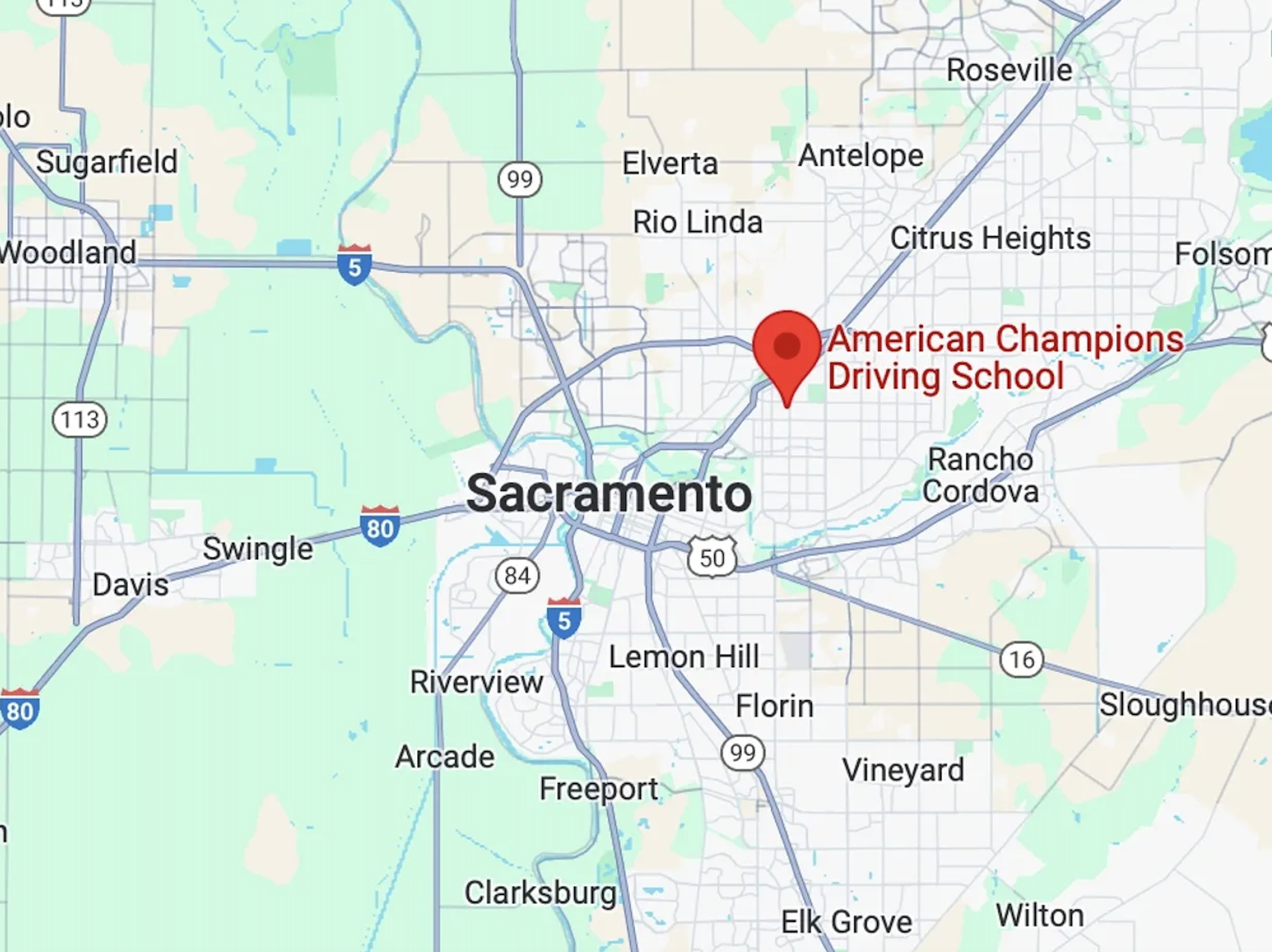 American Champions Driving School is committed to providing quality service to all of our esteemed clients, wherever they may be. Apart from being the best driving school in Sacramento, we serve our customers in the entire region - including Greater Sacramento, Folsom, Roseville, Elk Grove, Natomas, South Sacramento, Davis and Woodland. Get private driving lessons at the best prices in town.